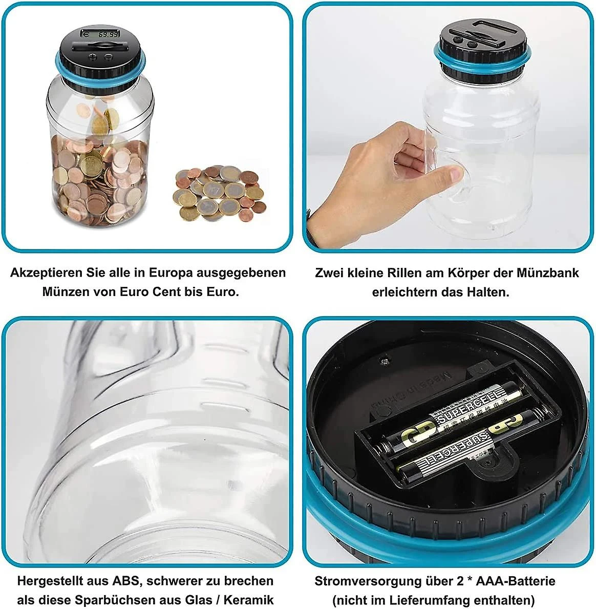 Creative design, with transparent design, you can feel the existence of coins at any time. A clear LCD display helps count your coins. A big bottleneck in the piggy bank can help you take out your coins easily.Made of ABS material, harder to break than glass or ceramic money boxes.