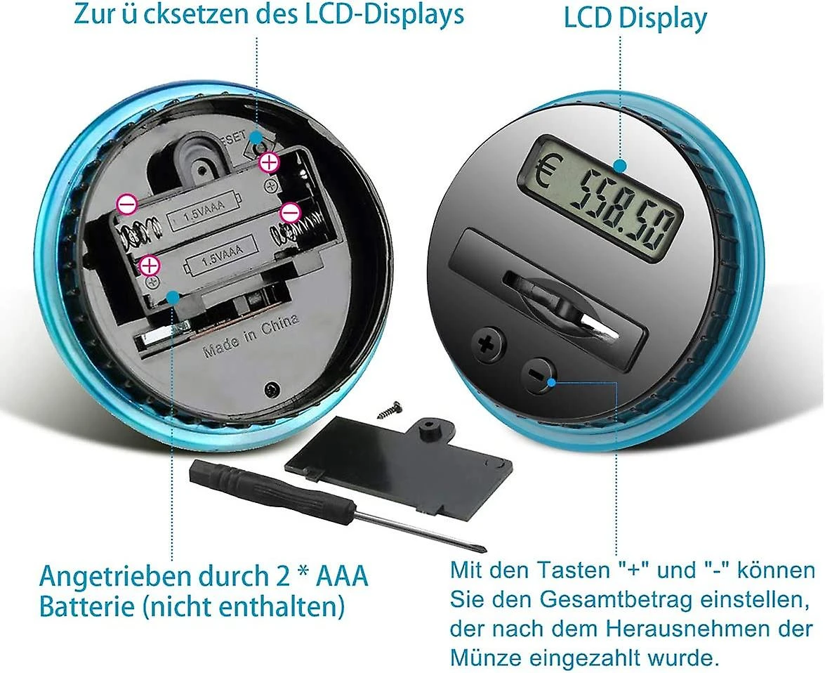 Put your coins in the bank. The value of the deposited money is clearly displayed on the LCD screen. Within seconds, the total value of the digital bank is clearly displayed.