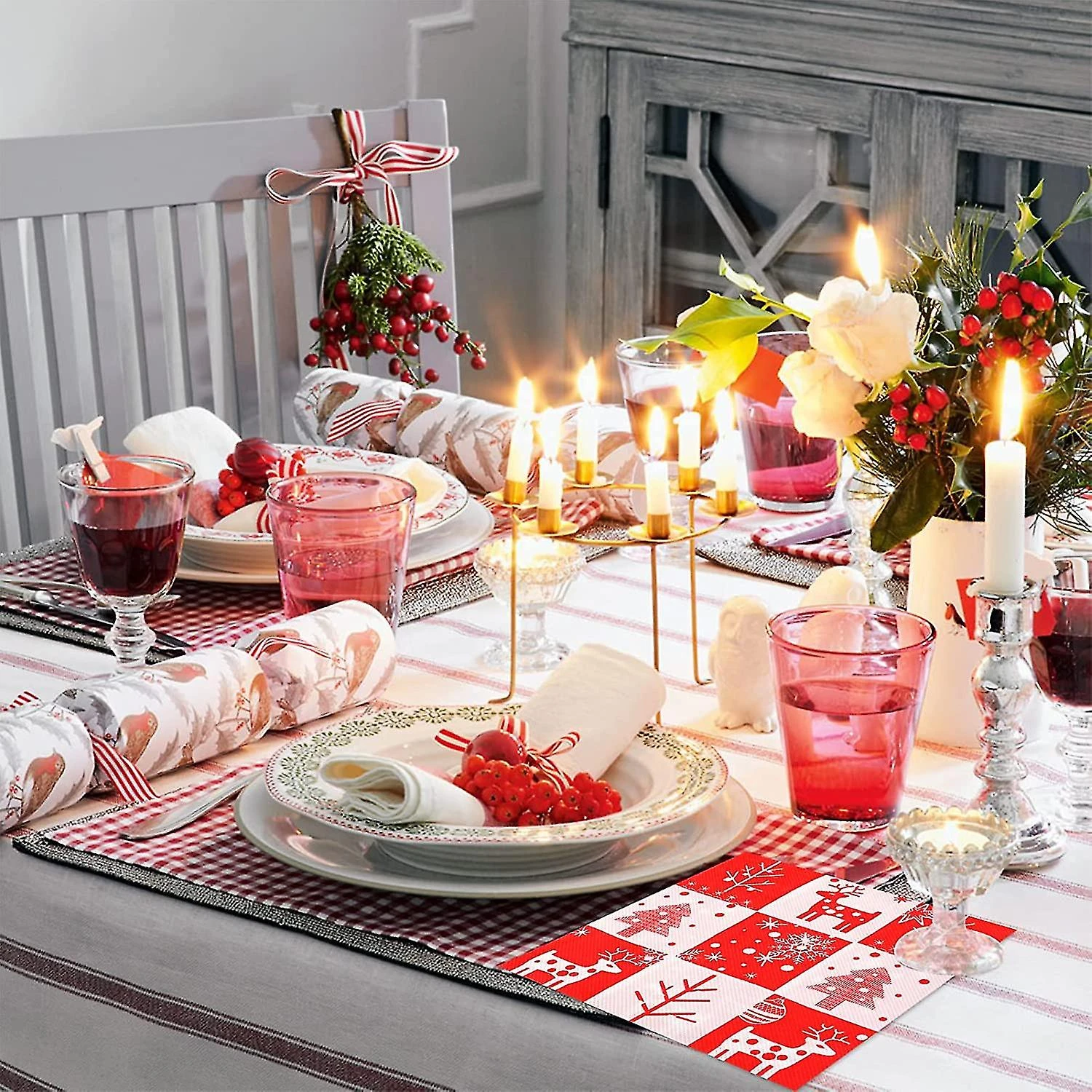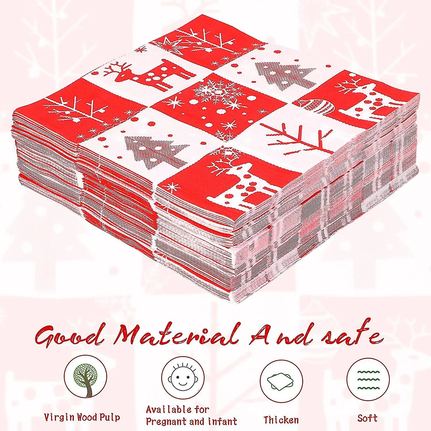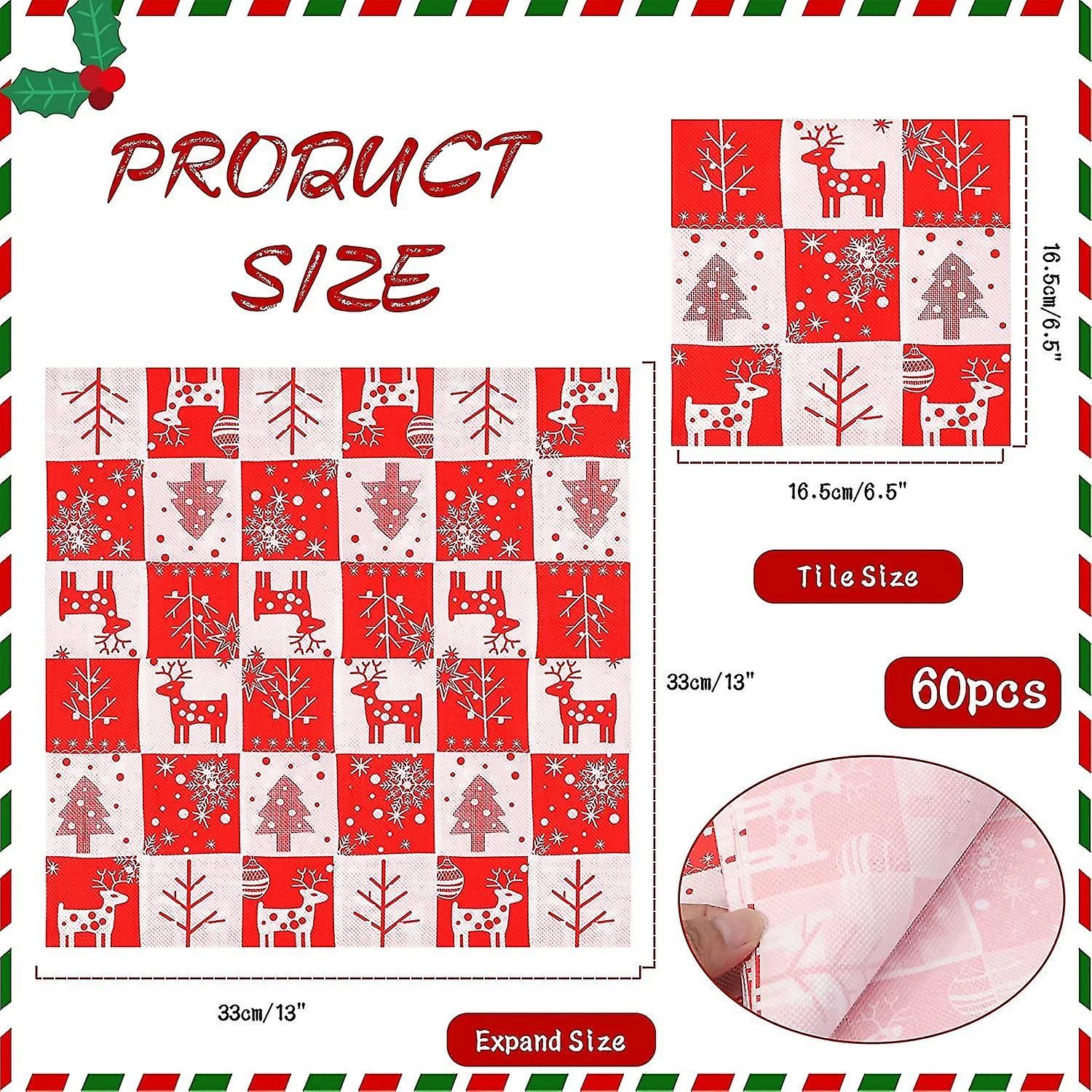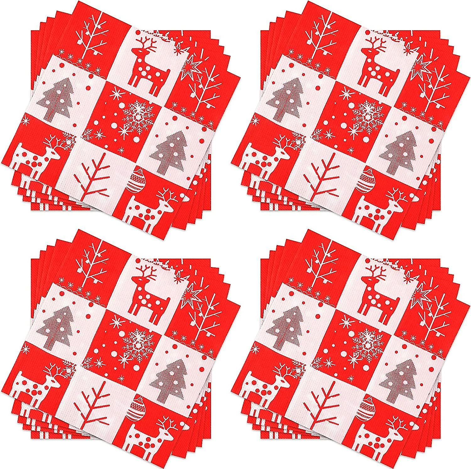 Dimensions – 16.5 x 16 .5 cm when folded, approximately 33 x 33 cm when unfolded. Each napkin features red reindeer, Christmas tree, snowflakes, five-pointed stars and polka dots print, unique creative style and vibrant colors, specially designed to convey the Christmas spirit
