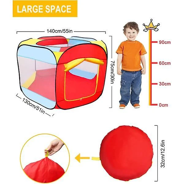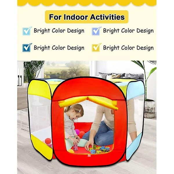 Safe and comfortable Designed with child safety and comfort in mind, the Ball Pit Play Tent has six sides, five of which have mesh. Mesh allows air to circulate through the play tent to keep the temperature within an ideal range as the mesh is transparent. Package: 1 x Ball Pit Tent (without marine balls) 1 x Storage Bag with Zipper Item No. 6b9230e2-f8f3-4de1-be07-a1851de6b4fc Read more