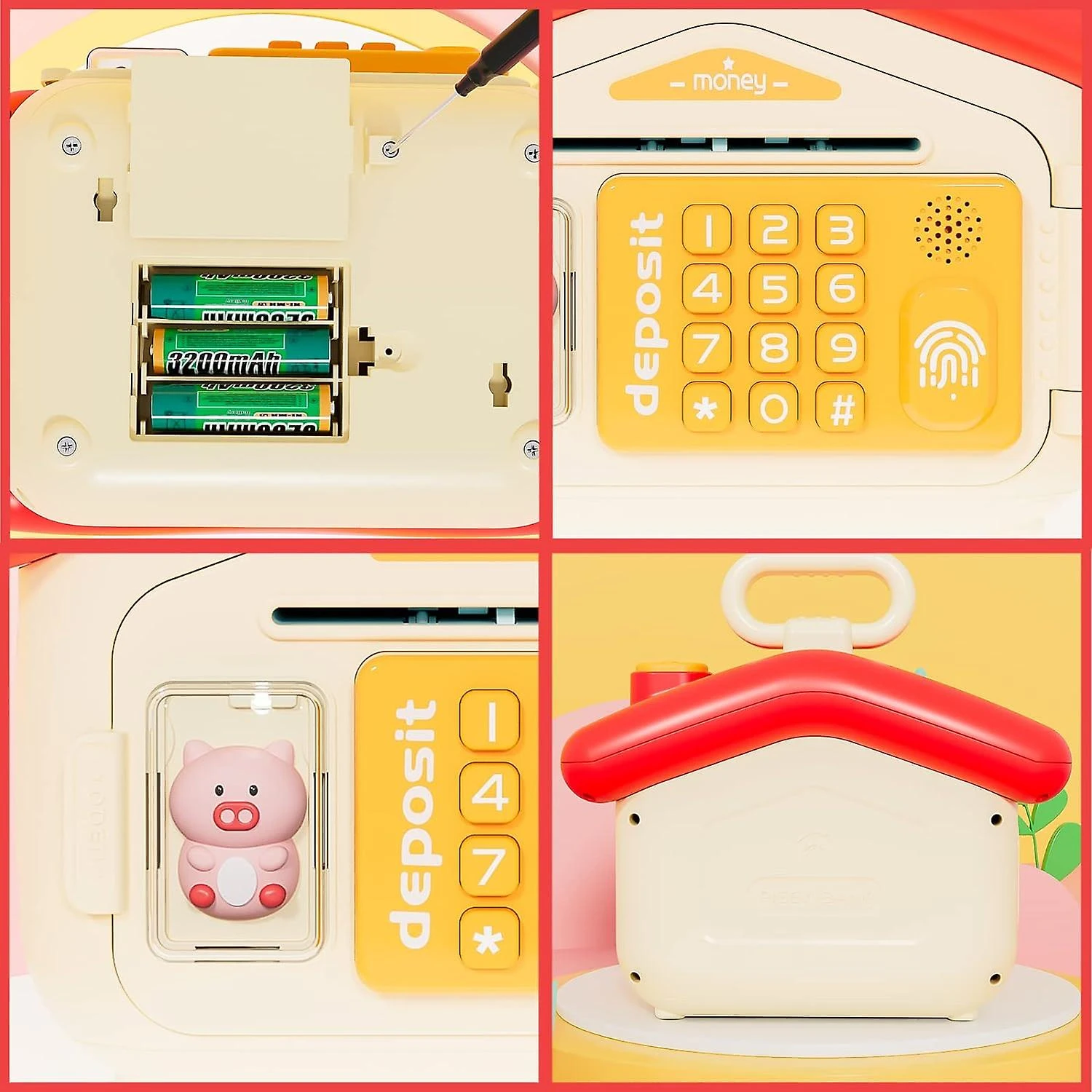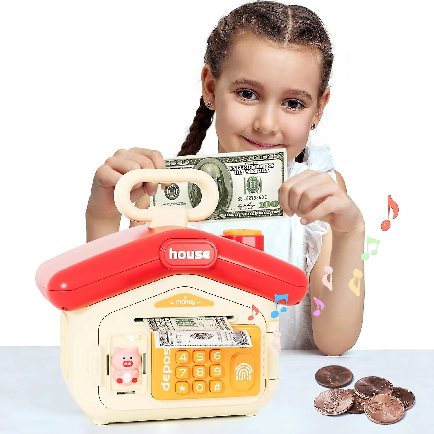NEW DESIGN PIGGY BANK for KIDS: Red house shape and piggy design are great for getting kids interested in saving and help train kids to start saving money habits. When you insert paper money through the slot, will be sucked in automatically.