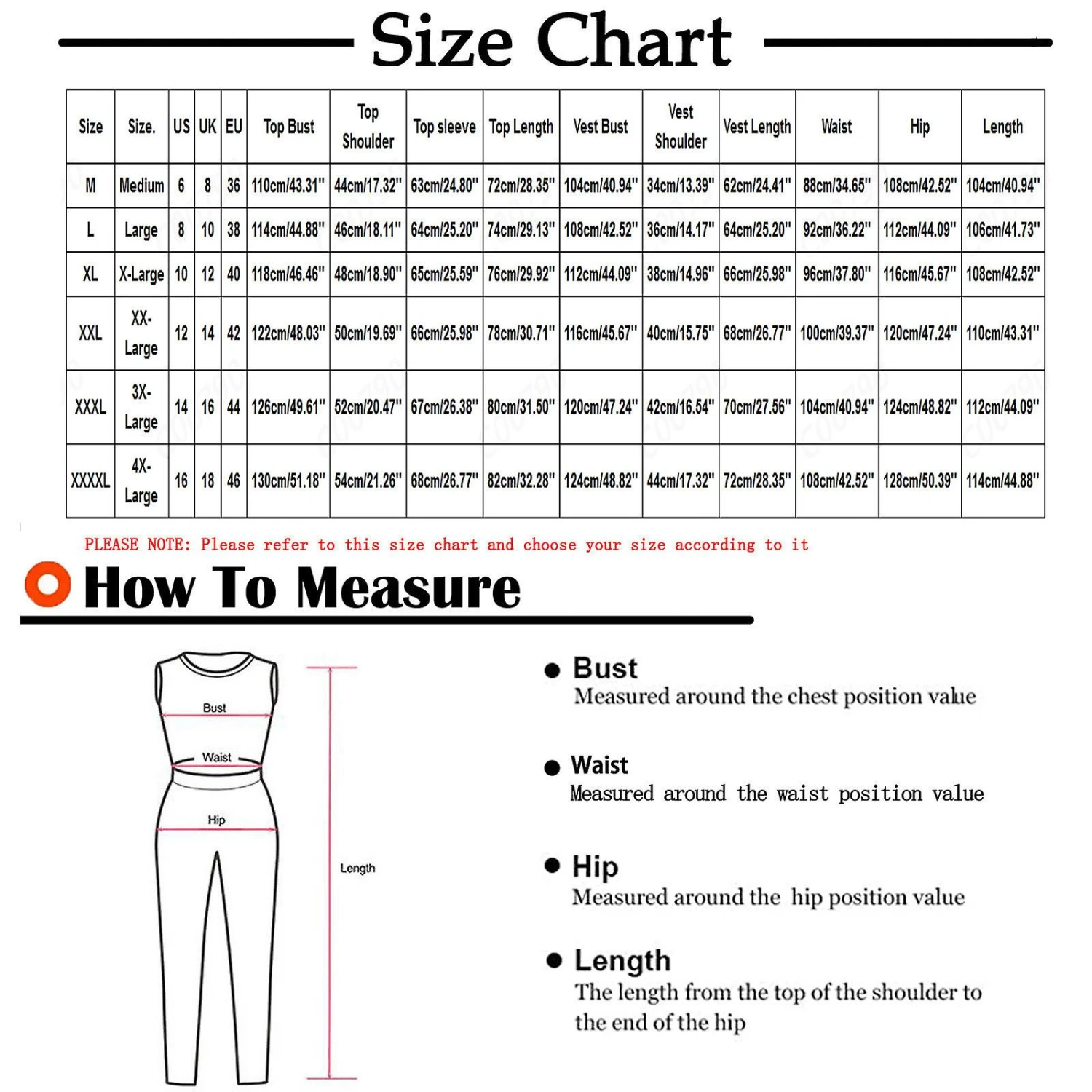 SizeSize.USUKEUTop BustTop ShoulderTop sleeveTop LengthVest BustVest ShoulderVest LengthWaistHipLengthMMedium6836110cm/43.31”44cm/17.32”63cm/24.80”72cm/28.35”104cm/40.94”34cm/13.39”62cm/24.41”88cm/34.65”108cm/42.52”104cm/40.94”LLarge81038114cm/44.88”46cm/18.11”64cm/25.20”74cm/29.13”108cm/42.52”36cm/14.17”64cm/25.20”92cm/36.22”112cm/44.09”106cm/41.73”XLX-Large101240118cm/46.46”48cm/18.90”65cm/25.59”76cm/29.92”112cm/44.09”38cm/14.96”66cm/25.98”96cm/37.80”116cm/45.67”108cm/42.52”XXLXX-Large121442122cm/48.03”50cm/19.69”66cm/25.98”78cm/30.71”116cm/45.67”40cm/15.75”68cm/26.77”100cm/39.37”120cm/47.24”110cm/43.31”XXXL3X-Large141644126cm/49.61”52cm/20.47”67cm/26.38”80cm/31.50”120cm/47.24”42cm/16.54”70cm/27.56”104cm/40.94”124cm/48.82”112cm/44.09”XXXXL4X-Large161846130cm/51.18”54cm/21.26”68cm/26.77”82cm/32.28”124cm/48.82”44cm/17.32”72cm/28.35”108cm/42.52”128cm/50.39”114cm/44.88”Size:MSize.:MediumUS:6UK:8EU:36Top Bust:110cm/43.31”Top Shoulder:44cm/17.32”Top sleeve:63cm/24.80”Top Length:72cm/28.35”Vest Bust:104cm/40.94”Vest Shoulder:34cm/13.39”Vest Length:62cm/24.41”Waist:88cm/34.65”Hip:108cm/42.52”Length:104cm/40.94”Size:LSize.:LargeUS:8UK:10EU:38Top Bust:114cm/44.88”Top Shoulder:46cm/18.11”Top sleeve:64cm/25.20”Top Length:74cm/29.13”Vest Bust:108cm/42.52”Vest Shoulder:36cm/14.17”Vest Length:64cm/25.20”Waist:92cm/36.22”Hip:112cm/44.09”Length:106cm/41.73”Size:XLSize.:X-LargeUS:10UK:12EU:40Top Bust:118cm/46.46”Top Shoulder:48cm/18.90”Top sleeve:65cm/25.59”Top Length:76cm/29.92”Vest Bust:112cm/44.09”Vest Shoulder:38cm/14.96”Vest Length:66cm/25.98”Waist:96cm/37.80”Hip:116cm/45.67”Length:108cm/42.52”Size:XXLSize.:XX-LargeUS:12UK:14EU:42Top Bust:122cm/48.03”Top Shoulder:50cm/19.69”Top sleeve:66cm/25.98”Top Length:78cm/30.71”Vest Bust:116cm/45.67”Vest Shoulder:40cm/15.75”Vest Length:68cm/26.77”Waist:100cm/39.37”Hip:120cm/47.24”Length:110cm/43.31”Size:XXXLSize.:3X-LargeUS:14UK:16EU:44Top Bust:126cm/49.61”Top Shoulder:52cm/20.47”Top sleeve:67cm/26.38”Top Length:80cm/31.50”Vest Bust:120cm/47.24”Vest Shoulder:42cm/16.54”Vest Length:70cm/27.56”Waist:104cm/40.94”Hip:124cm/48.82”Length:112cm/44.09”Size:XXXXLSize.:4X-LargeUS:16UK:18EU:46Top Bust:130cm/51.18”Top Shoulder:54cm/21.26”Top sleeve:68cm/26.77”Top Length:82cm/32.28”Vest Bust:124cm/48.82”Vest Shoulder:44cm/17.32”Vest Length:72cm/28.35”Waist:108cm/42.52”Hip:128cm/50.39”Length:114cm/44.88”
